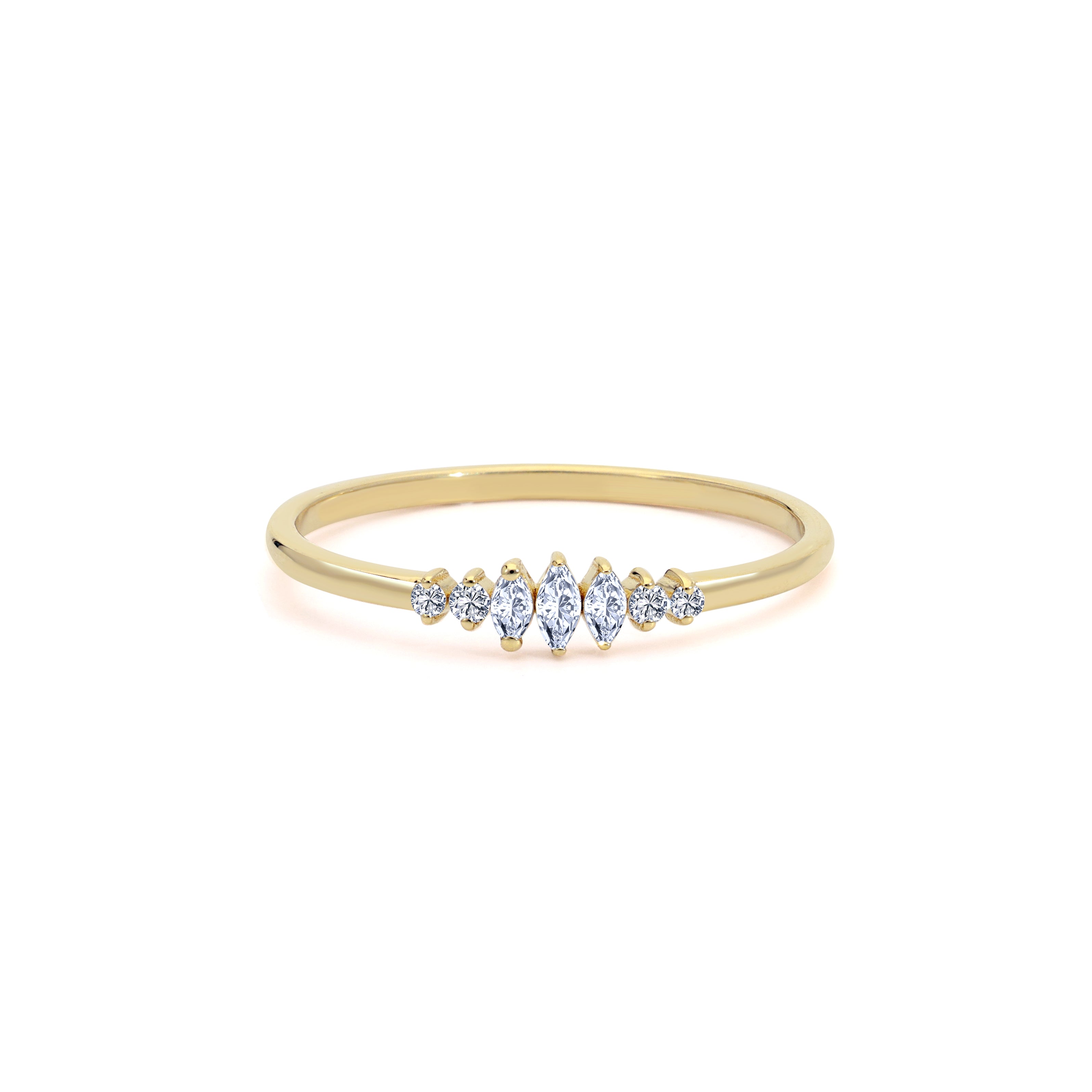 • A delicate gold band adorned with a sparkling mix of marquise and round-cut diamonds, designed to catch the light from every angle. Elegant and minimal, this ring is perfect for stacking or wearing solo as a subtle statement of everyday luxury.
